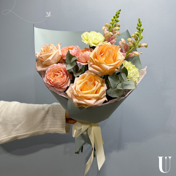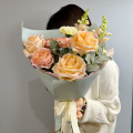 Монобукет из пионовидных роз Кахала и лимониума в нежной упаковке