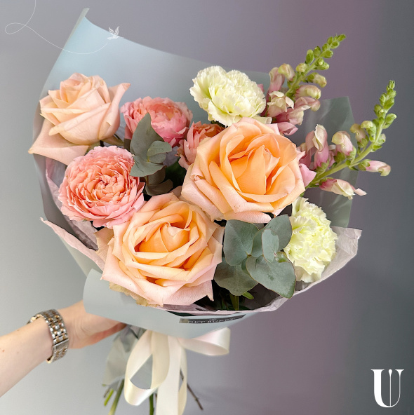 Композиция из нежных роз и гвоздик в стильной упаковке