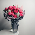 Композиция из сиреневых роз и диантусов в упаковке
