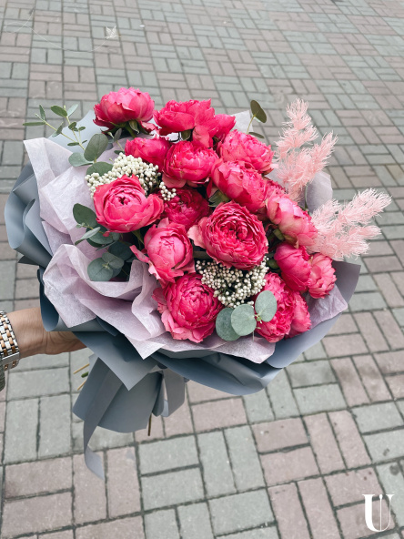 Авторский букет из роз и других цветов в дизайнерской упаковке