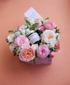 - Коробка сердце 14*14 см- 1 шт. Роза пионовидная - 2 шт. Роза пионовидная кустовая - 5 шт. Роза кустовая - 1 шт. Озотамнус - 1 шт. Питтоспорум - 2 шт