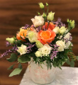 На усмотрение флориста в состав может входить микс из цветов: роза, лизиантус, лимониум, эвкалипт, фисташка