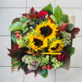 В состав может входить микс из цветов: роза, подсолнухи, гортензия, седум, хиперикум, листья дуба, салал