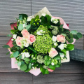 В состав может входить микс из цветов: роза, гортензия, седум, хиперикум, лизиантус, седум или трахелиум, салал, эвкалипт