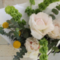 Букет с пионами, ирландскими колокольчиками, краспедией и эвкалиптом.