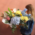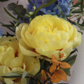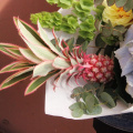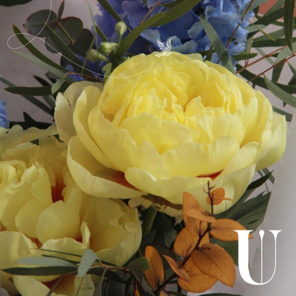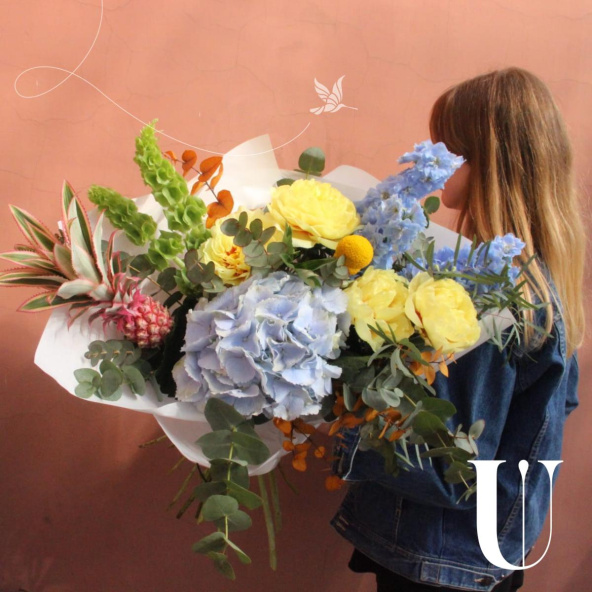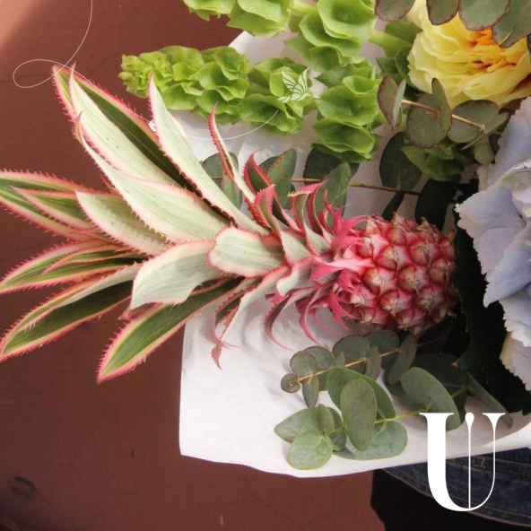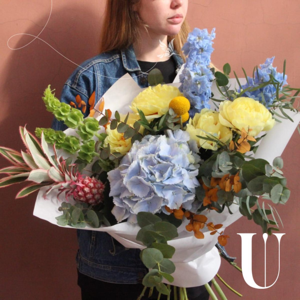 - Неординарный букет с ананасом, французскими жёлтыми пионами, гортензий, ирландскими колокольчиками, дельфиниумом, краспедией и эвкалиптом