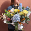 - В составе: ананас 1 шт, пион 4 шт, гортензия 1 шт, ирландские колокольчики 2 шт, дельфиниум 3 шт, краспедия 2 шт, эвкалипт 10 шт, эвкалипт стабилизированный 2 шт, бумага, лента