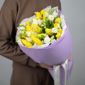 Большой дизайнерский букет из пионовидных роз, белых орхидей, тюльпанов и других цветов в дизайнерской упаковке