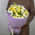 Авторский букет из роз, эустом и диантусов в дизайнерской упаковке