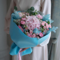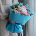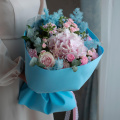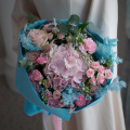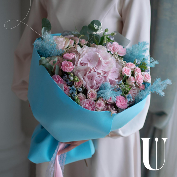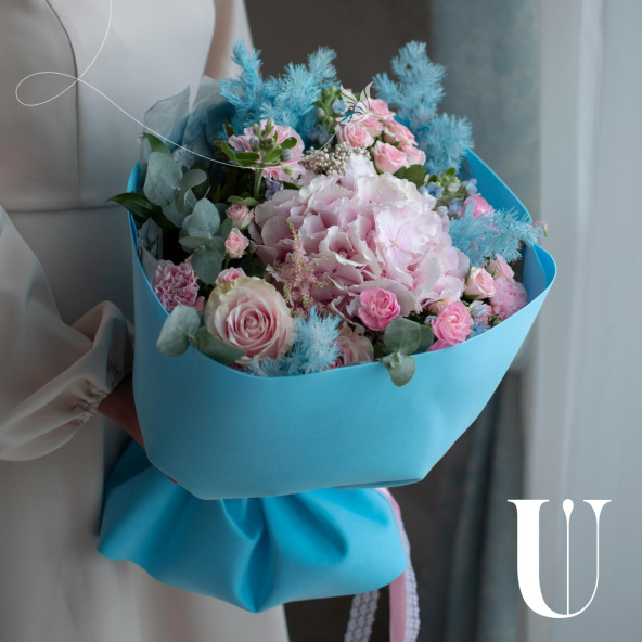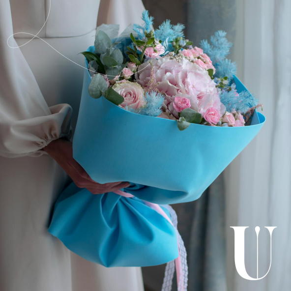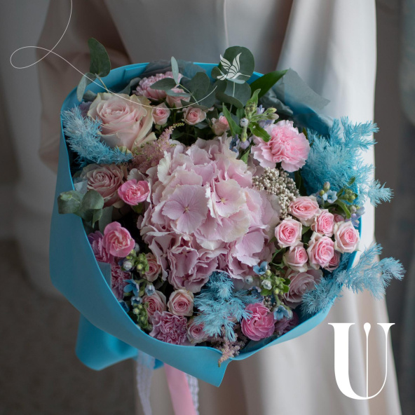 Авторский букет из роз Кантри Блюз, розовых эустом, роз Эксплорер и диантусов Мун Аква в дизайнерской упаковке