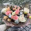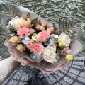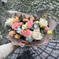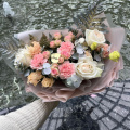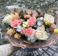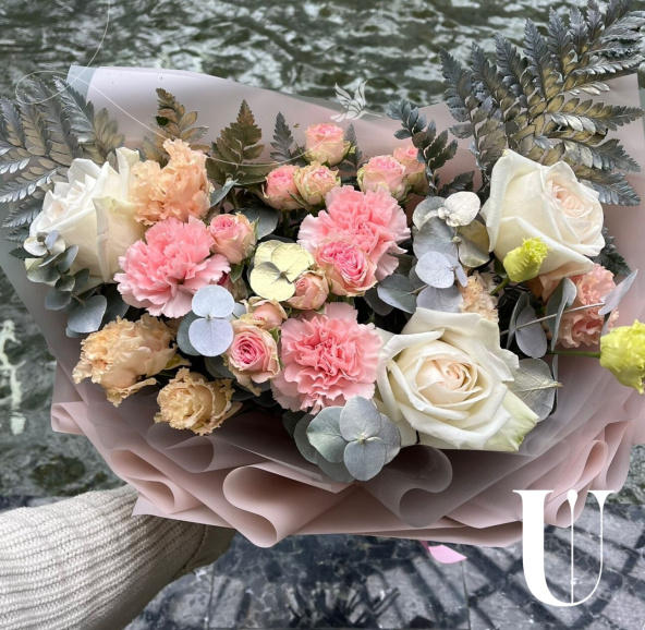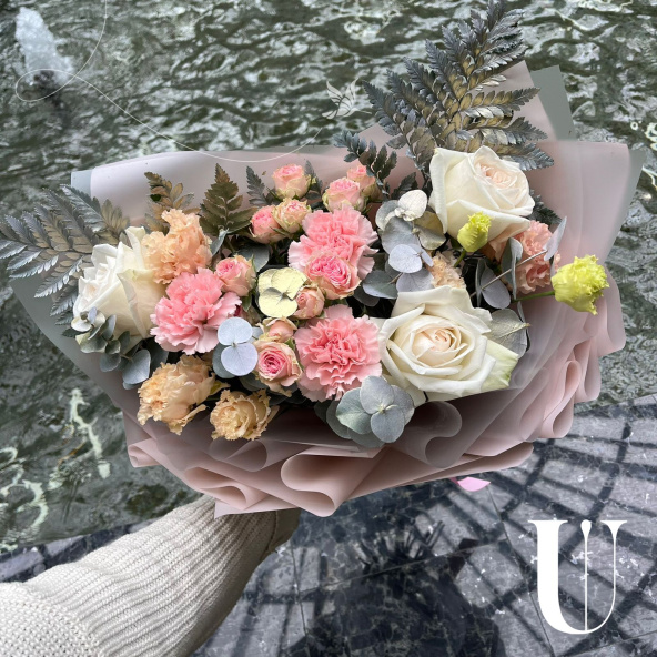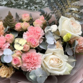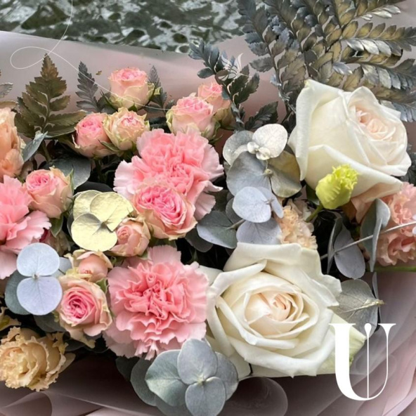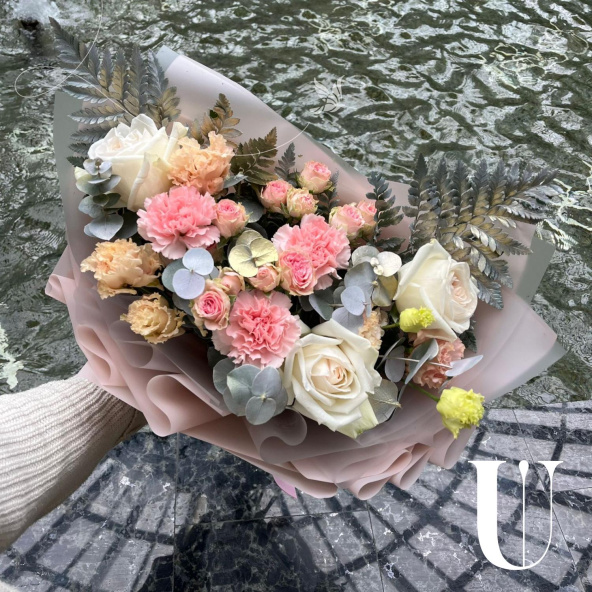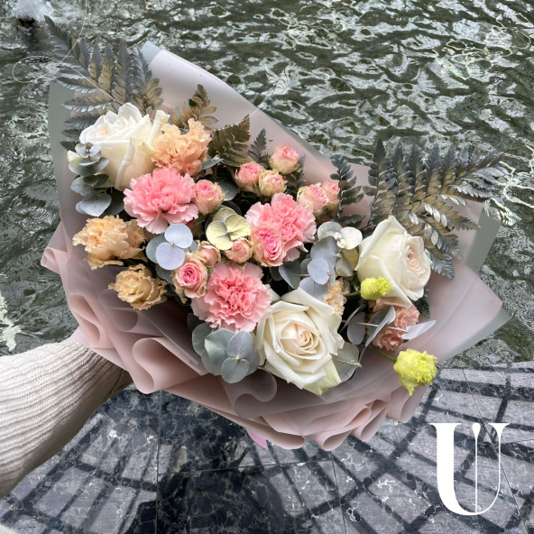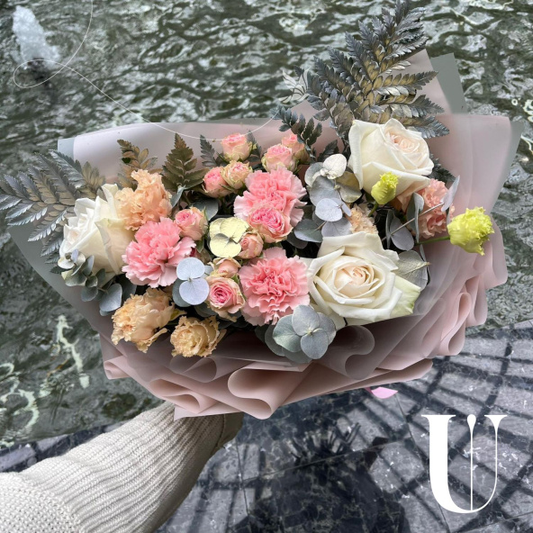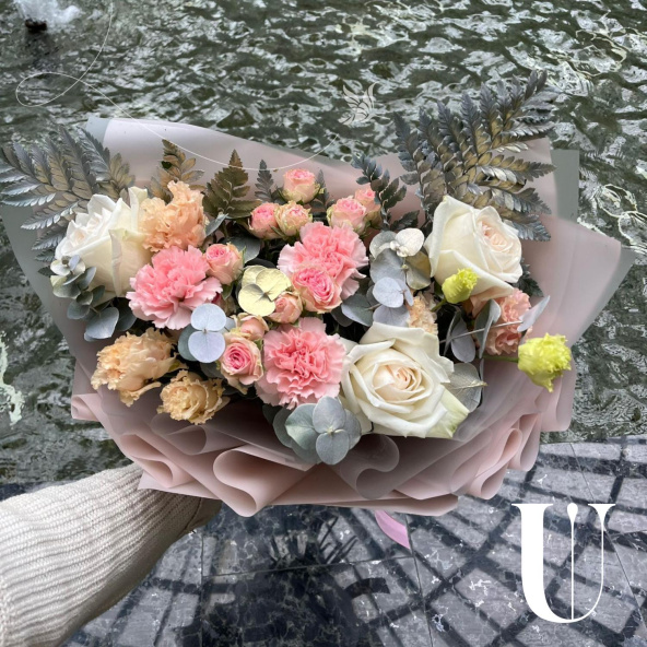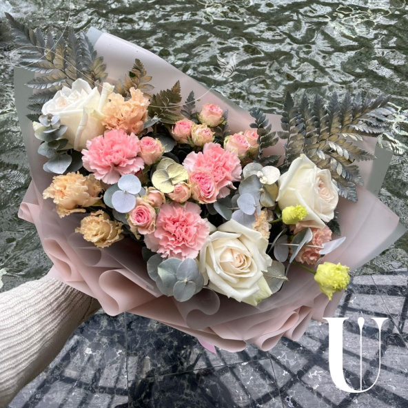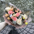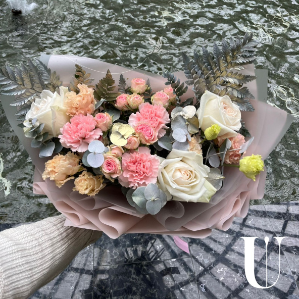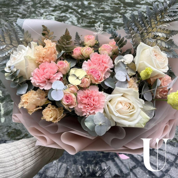 Букет из пионовидных роз, гвоздик и лизиантуса – это изысканная композиция, сочетающая в себе богатство текстур и утонченность форм. Пионовидные розы, своими пышными и многослойными лепестками, создают впечатление изысканности и роскоши. Гвоздики добавляют букету яркость и насыщенные оттенки, привнося в него динамику и энергию. Лизиантус, с его нежными и деликатными цветами, вносит нотки романтики и лёгкости, делая композицию воздушной и утончённой. Этот букет станет идеальным украшением любого интерьера и прекрасным подарком, выражающим самые тёплые и искренние чувства.