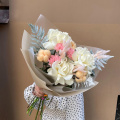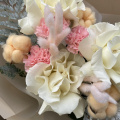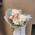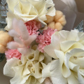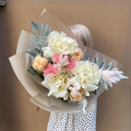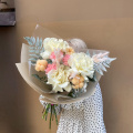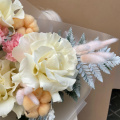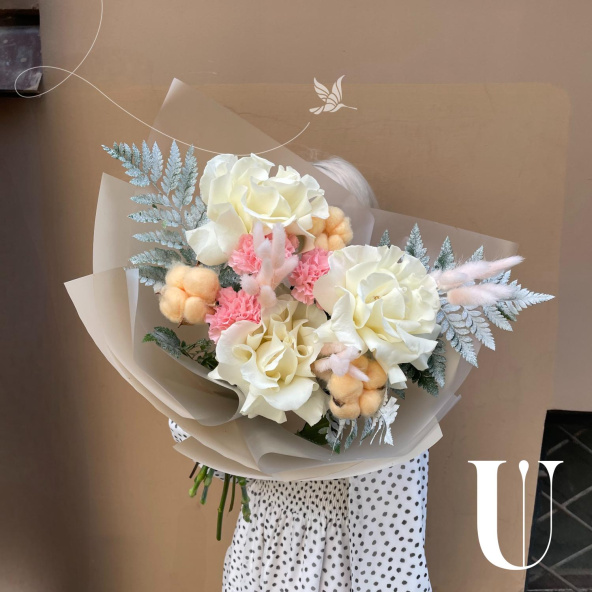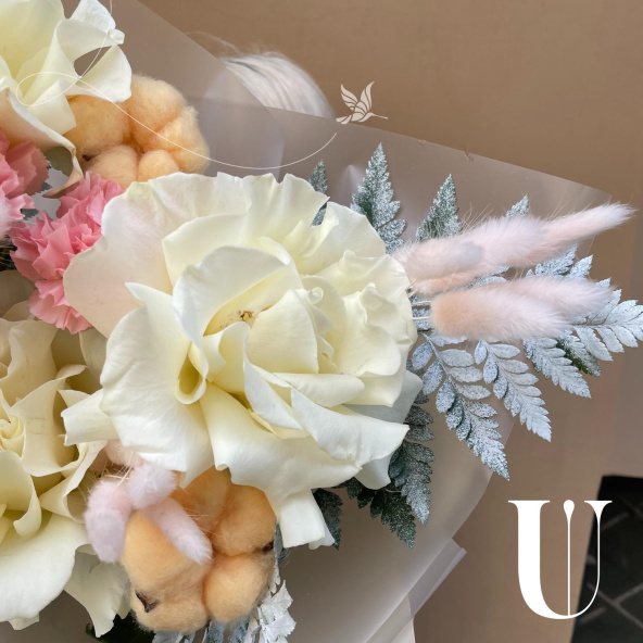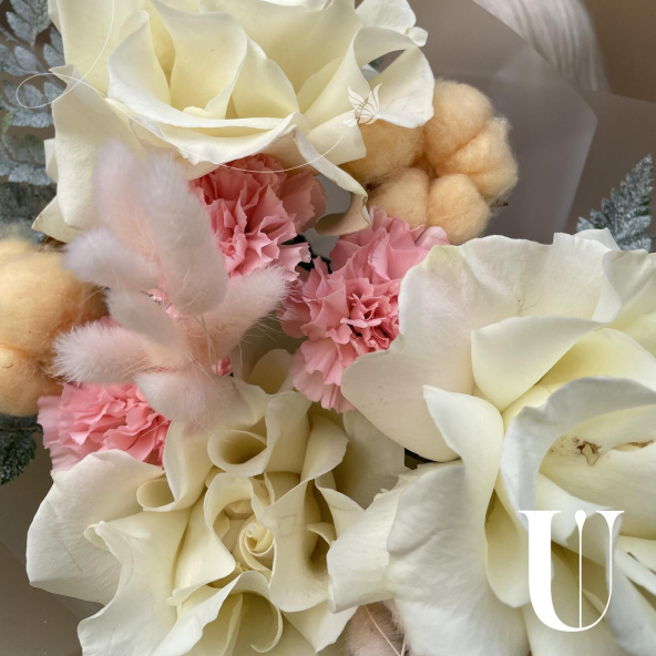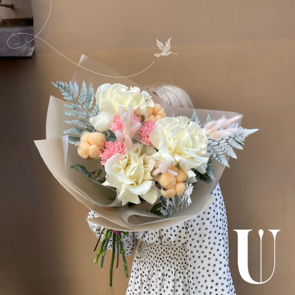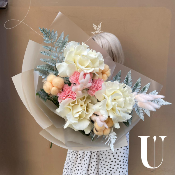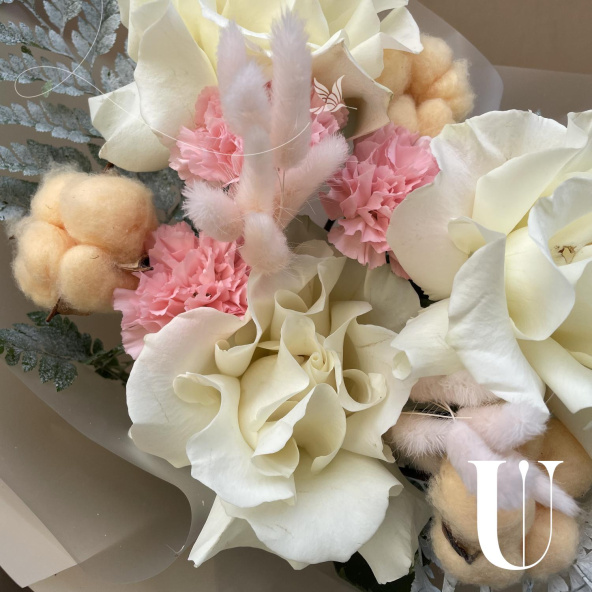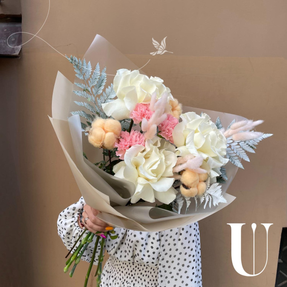 Этот элегантный сборный букет — гармоничное сочетание утонченности и ярких акцентов. В его основе — белые французские вывернутые розы сорта Мондаиль, символизирующие чистоту и изящество. В качестве яркого дополнения — апельсиновый хлопок и розовые гвоздики, которые добавляют композиции живости, тепла и солнечного настроения. Пушистый нежно-розовый лагурус придает букету мягкость и объем, а крашеный папоротник создает интересные текстурные контрасты, подчеркивая природную красоту.