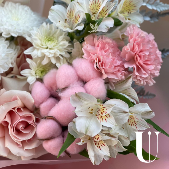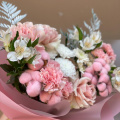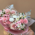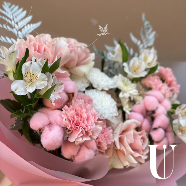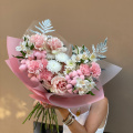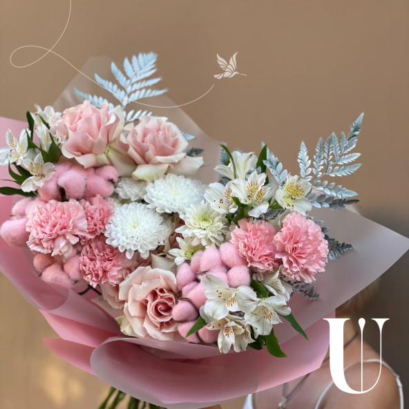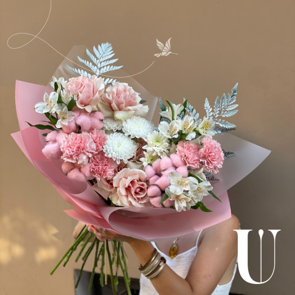 Этот букет — словно живописное полотно, написанное нежными акварельными мазками. Нежно-розовые французские розы выступают главными героями композиции, подобно солирующим скрипкам в оркестре. Белые альстромерии и кустовые хризантемы создают гармоничный фон, как переливы клавиш рояля, а розовые гвоздики добавляют лёгкие акценты — будто флейта, вплетающая в мелодию свои звонкие ноты.