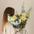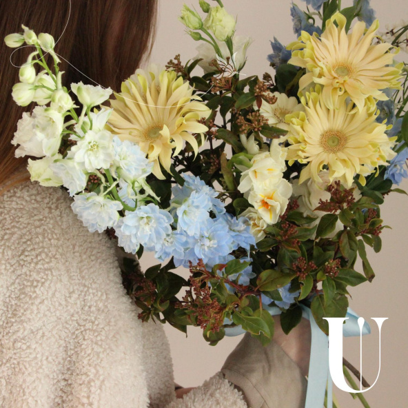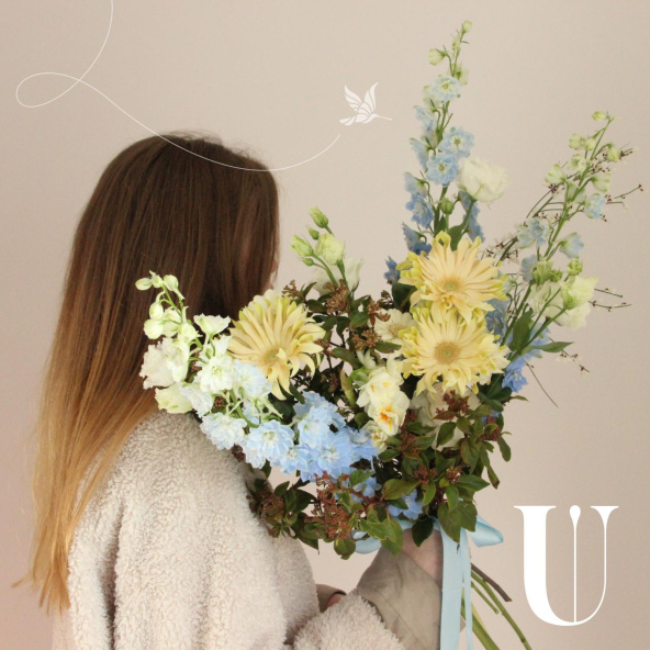Авторский букет с сортовыми герберами, дельфиниумом, лизиантусом и зеленью. Стильное цветочное решение для любого случая.