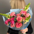 Авторский букет из малиновой гортензии, розовых диантусов и розовых кустовых роз в стильной упаковке