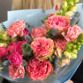 Авторский букет из розы Пинк Охара, розовых диантусов и роз мондиаль в дизайнерской упаковке