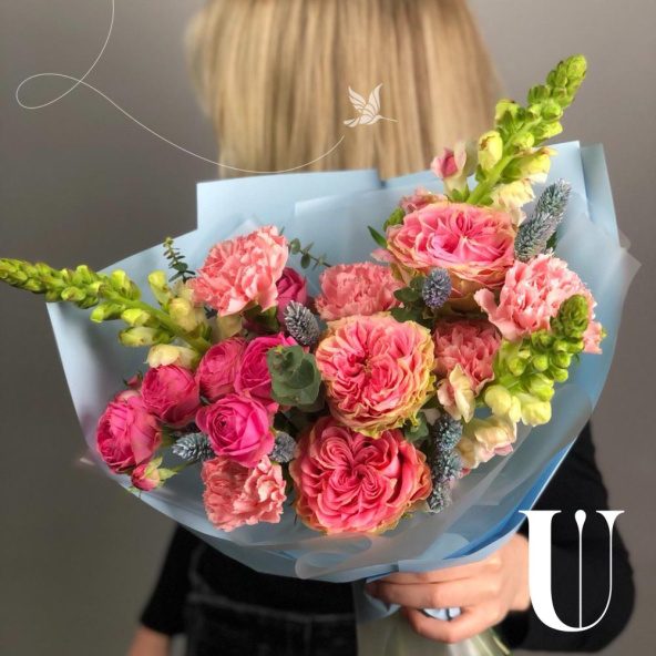Авторский букет из роз и других цветов в дизайнерской упаковке