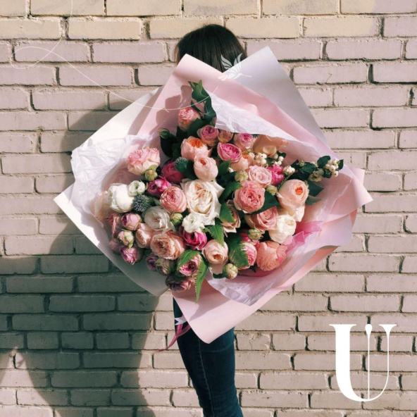 - Множество кустовых и одноголовых пионовидных роз с зеленью эвкалипта. Упаковка - корейская пленка. Все работы