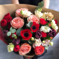 Авторский букет из роз, маттиол и других цветов в дизайнерской упаковке