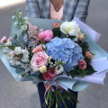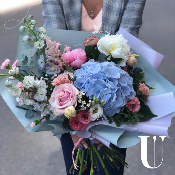 В составе: гортензия, розы пионовидные, дельфиниум, эустома