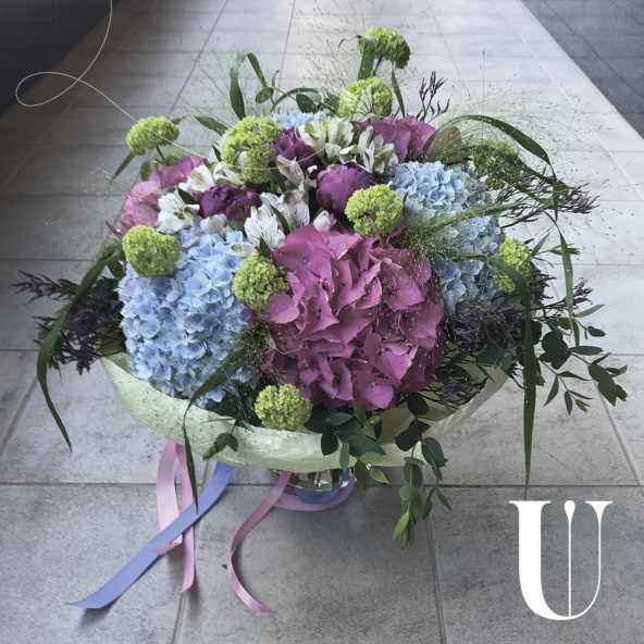 - Листья салала и каркас из веточек. Состав букета может измениться в зависимости от сезона и наличия цветов в салоне