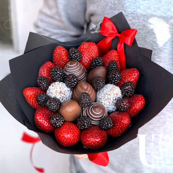 В данном размере букета помещается до 23 ягод отборной и крупной клубники.А так же добавление ягод ежевики Средний вес букета- 1.2 кг!