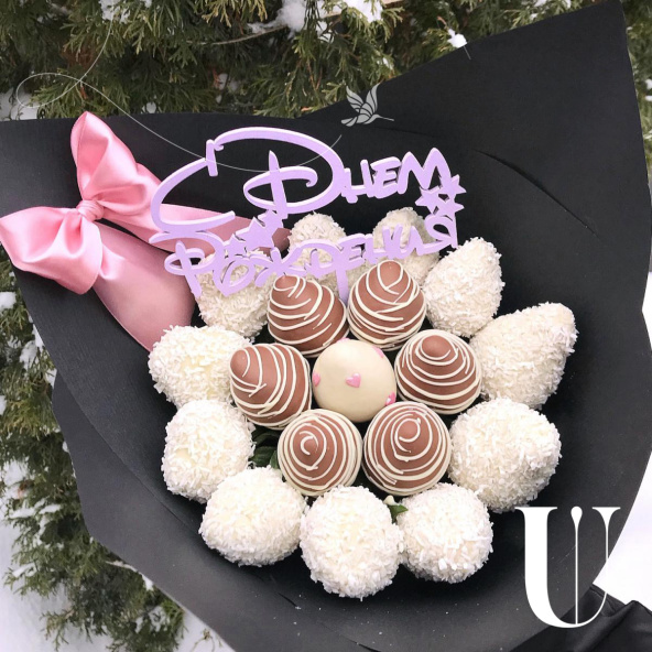 В данном размере букета помещается до 23 ягод отборной и крупной клубники. Средний вес букета- 1.2 кг!