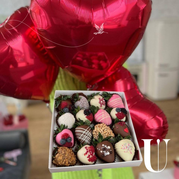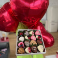 Романтичное сочетание: три фольгированных шарика в виде сердечек и изысканная коробочка клубники в бельгийском молочном и белом шоколаде. Хороший способ выразить чувства или сделать день особенным