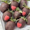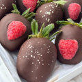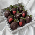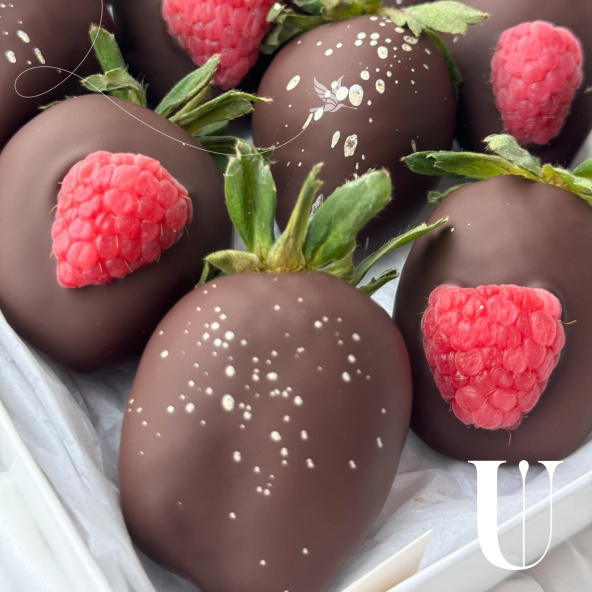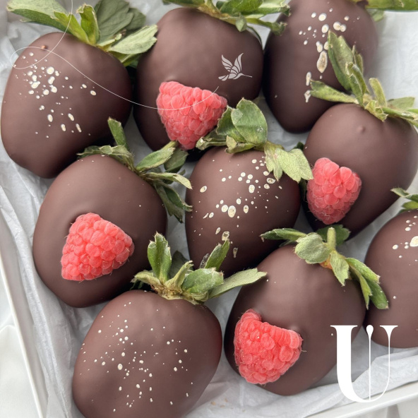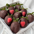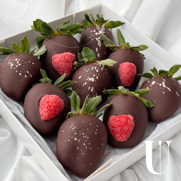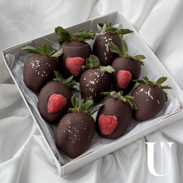 Набор из клубники в темном бельгийском шоколаде. Мы украсили свежей малиной и брызгами пищевого серебра. Стиль, аромат, вкус, красота - всё это об этом наборе.