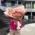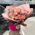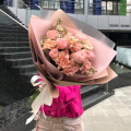 Букет из розовых роз и нежных гвоздик в упаковке