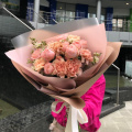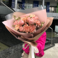 Букет из кустовыъ малиновых роз, карамельных диантусов и пионовидной розы Пинк Экспрешн в дизайнерской упаковке