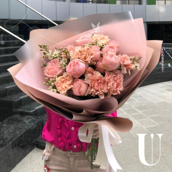 Букет из кремовых диантусов и пионовидных роз Мандарин Экспрешн в упаковке