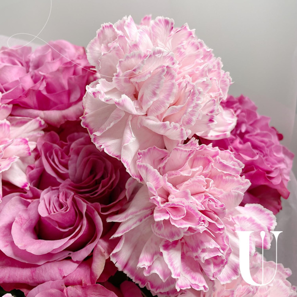 Букет из роз Пинк Охара, розовых диантусов и кустовых роз в упаковке