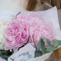 Букет из розовых пионовидных роз и кремовых диантусов в упаковке
