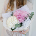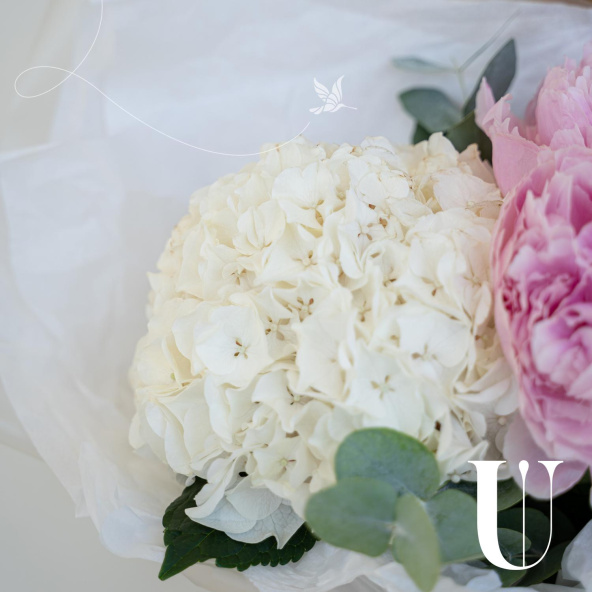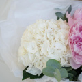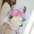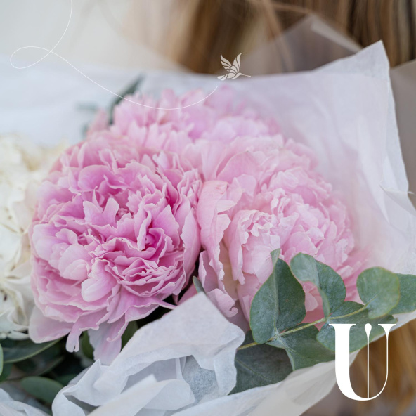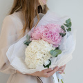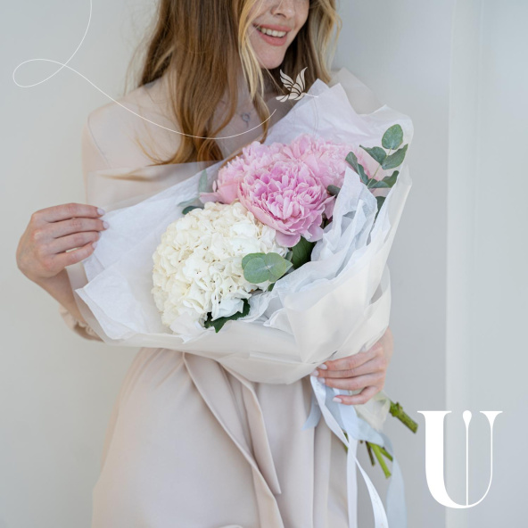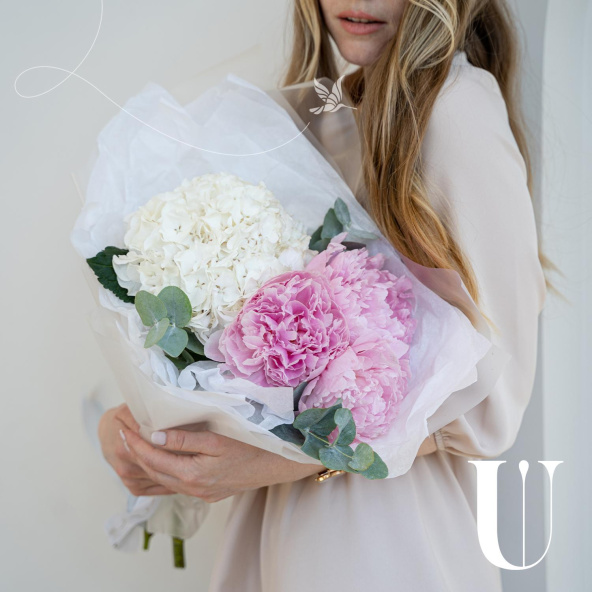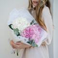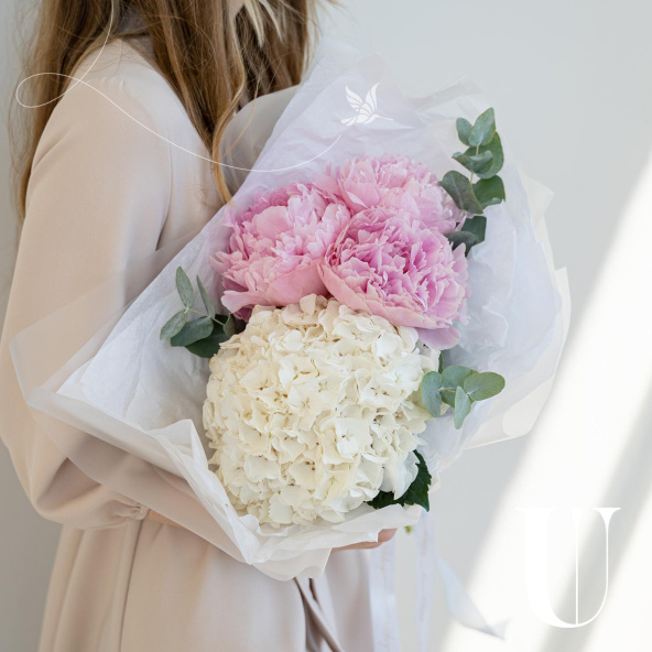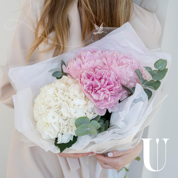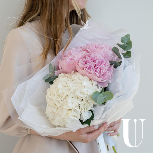 Дуо-букет из пионовидных и французских роз в стильной серой упаковке
