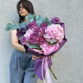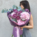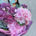 Букет из белых гортензий и нежно-розовых кустовых роз в упаковке