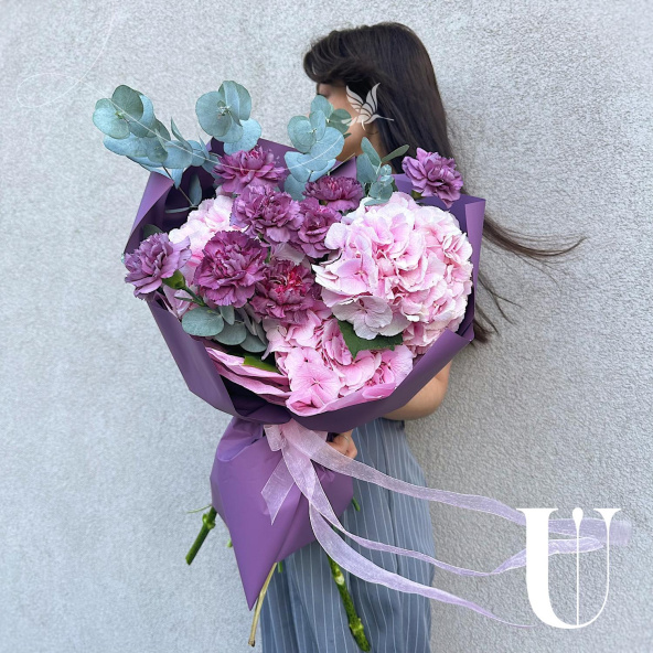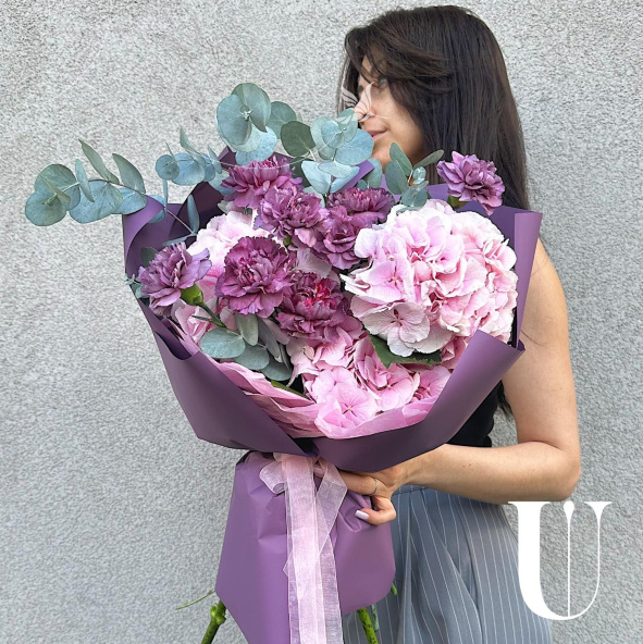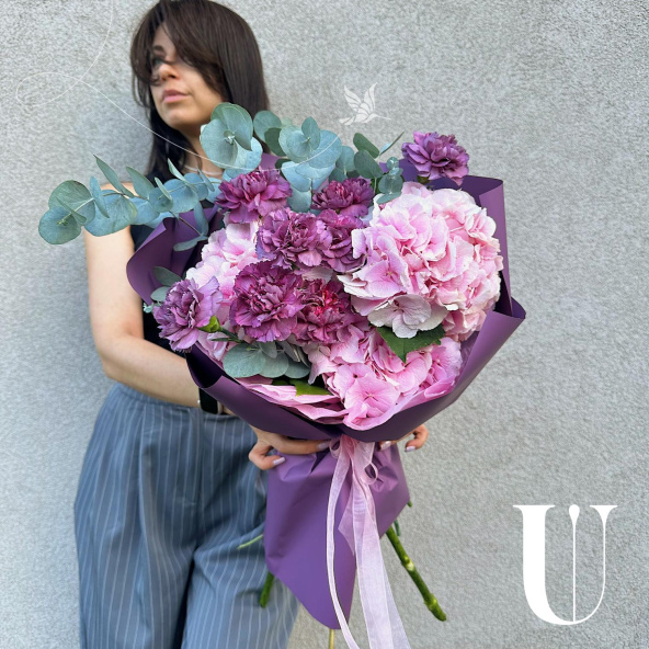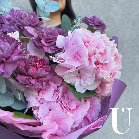 Букет из белой гортензии, розовых кустовых роз и нежных диантусов в белой упаковке