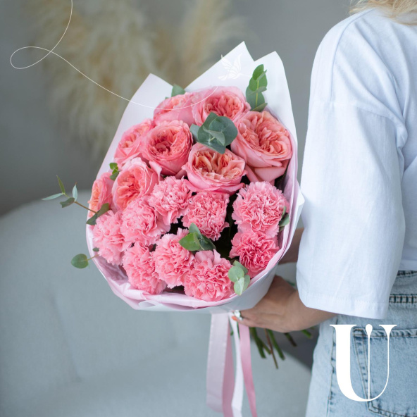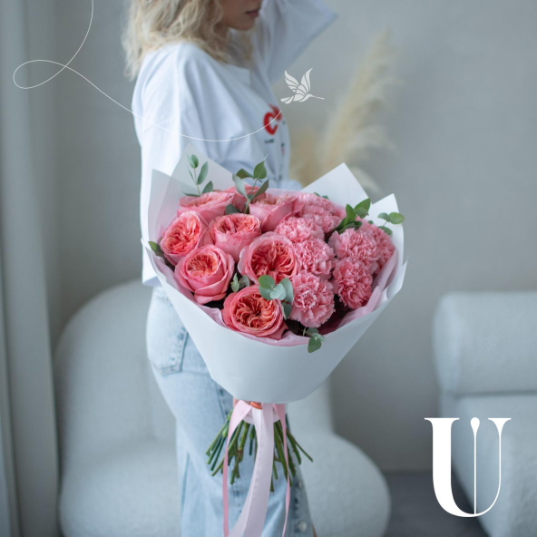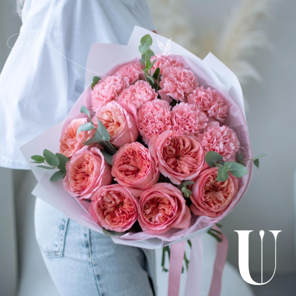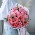 Дуобукет из пионовидных роз и диантусов с упаковкой тишью и фоамиран.