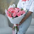 Букет из роз Пинк Мондиаль 50 см, кустовых роз и кремовых диантусов в дизайнерской упаковке