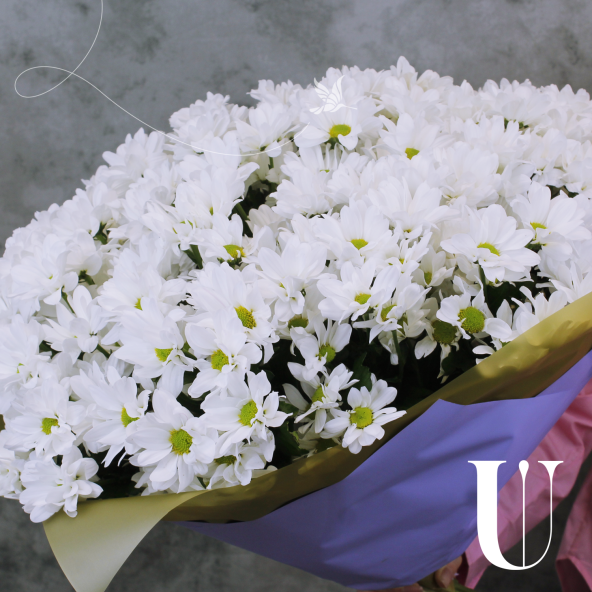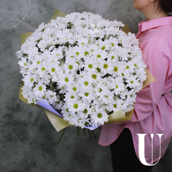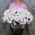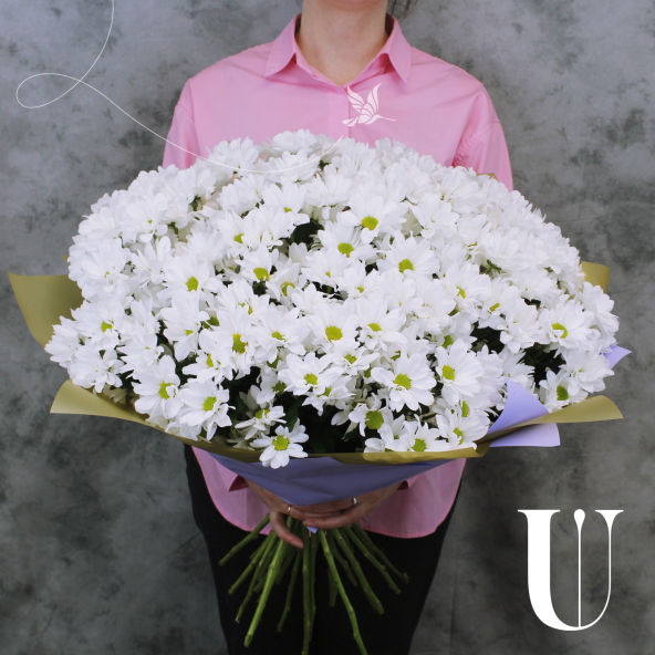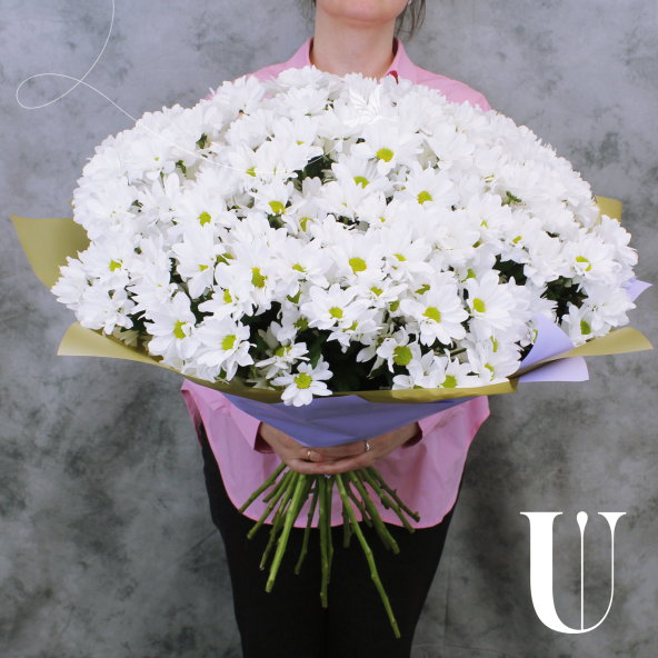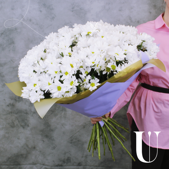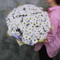 Классический букет из 25 белых кустовых ромашковых хризантем в матовой пленке с атласной лентой — это отличный выбор для тех, кто хочет подарить радость и тепло близким людям.