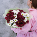 Букет из 7 белых и бордовых кустовых ромашковых хризантем в матовой пленке с атласной лентой — это отличный выбор для тех, кто хочет подарить радость и тепло близким людям.