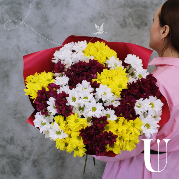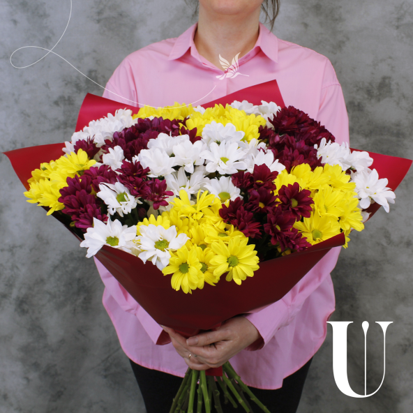 Классический букет из 15 разноцветных кустовых ромашковых хризантем в матовой пленке с атласной лентой — это стильный и яркий подарок для любого повода. Разноцветные кустовые хризантемы в букете создают неповторимую яркую и нежную композицию, которая придется по вкусу даже самому искушенному получателю.