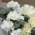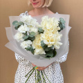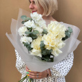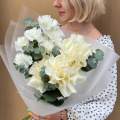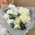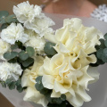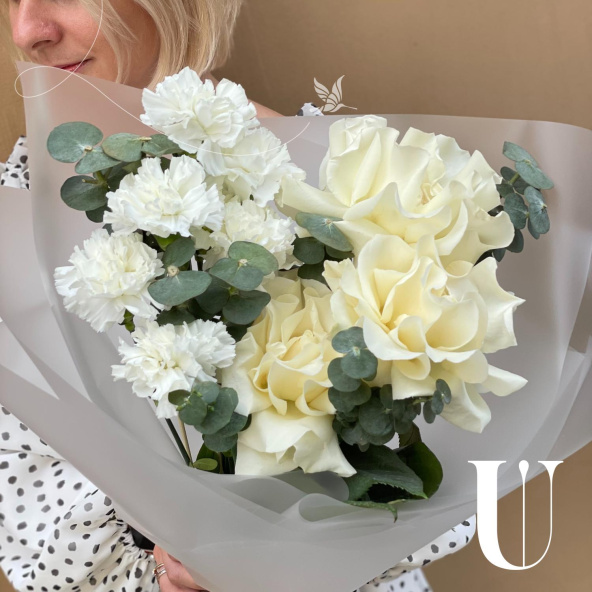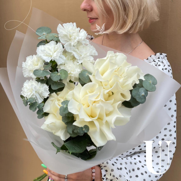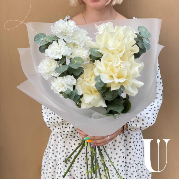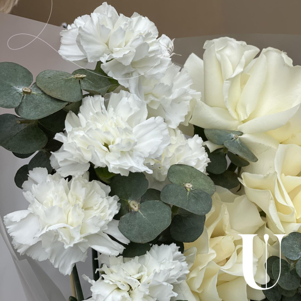 Завершает этот чарующий ансамбль свежий эвкалипт с его серебристо-зелеными листьями, которые привносят в букет нотки природы и свежести. Легкий аромат эвкалипта придает композиции особое очарование, создавая гармонию между цветами.