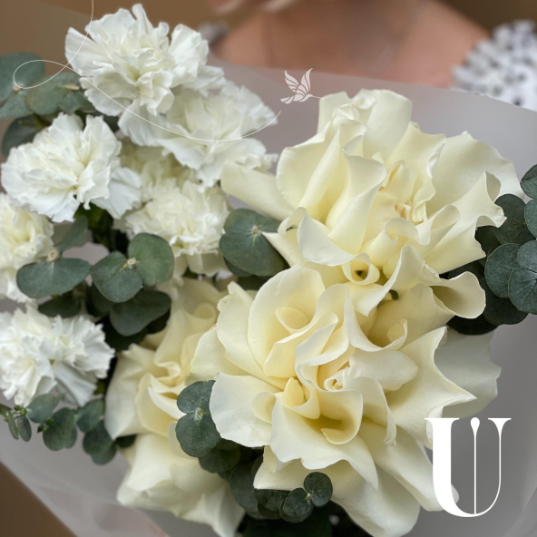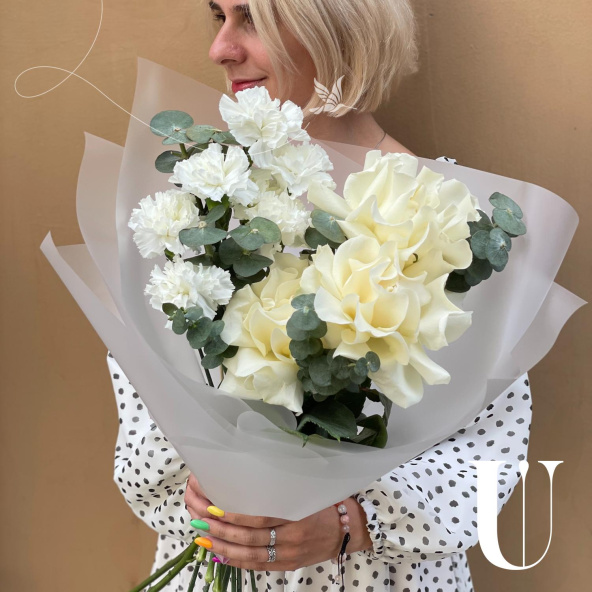 Этот изысканный букет — истинное воплощение нежности и утонченности. Белые кружевные французские розы, с их бархатистыми лепестками и тонким ароматом, создают романтичное настроение, словно перешептывая о любви и красоте. Их элегантная форма и мягкий блеск придают букету воздушность и светлую ауру.