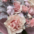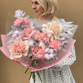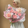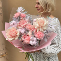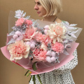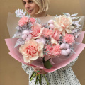 Этот изысканный букет сочетает в себе нежность и элегантность, создавая гармоничное произведение искусства. Нежно-розовые французские розы, с их бархатистыми лепестками и утонченным ароматом, становятся центральным элементом композиции, символизируя любовь и восхищение. Розовые гвоздики добавляют текстурное разнообразие и легкую игривость, их яркие оттенки прекрасно дополняют общую палитру.