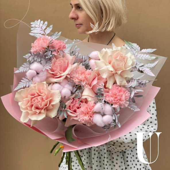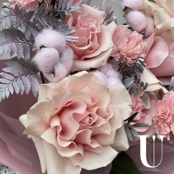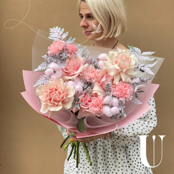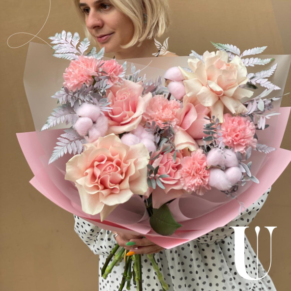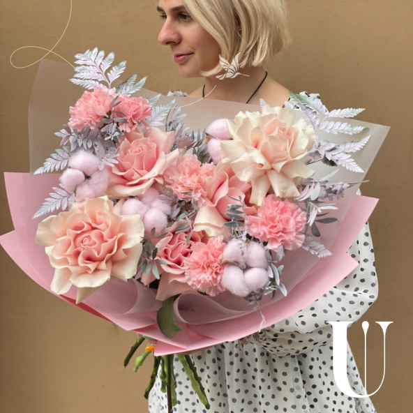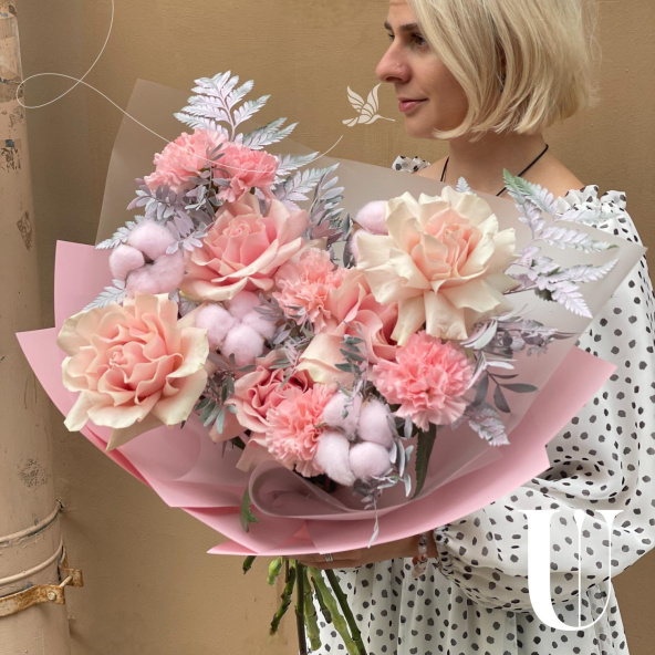 Мягкий розовый хлопок вносит элемент уюта и естественности, словно облачко, обнимающее цветы и придающее букету особую теплоту. Листья папоротника, с их изящной рассеченной формой, создают эффектную рамку, подчеркивая красоту каждого элемента и добавляя свежести и зелени.