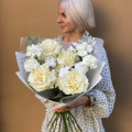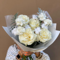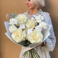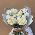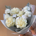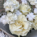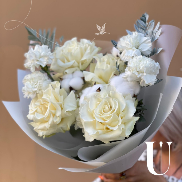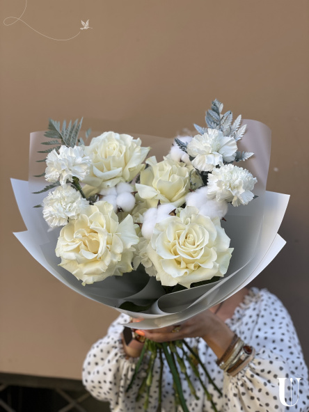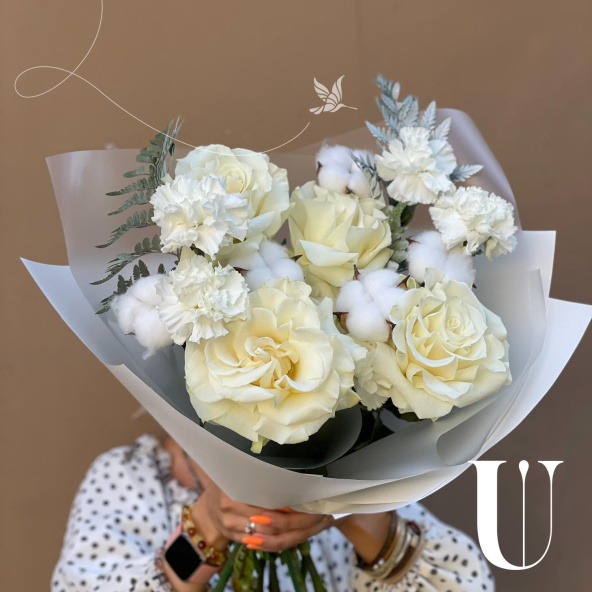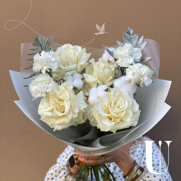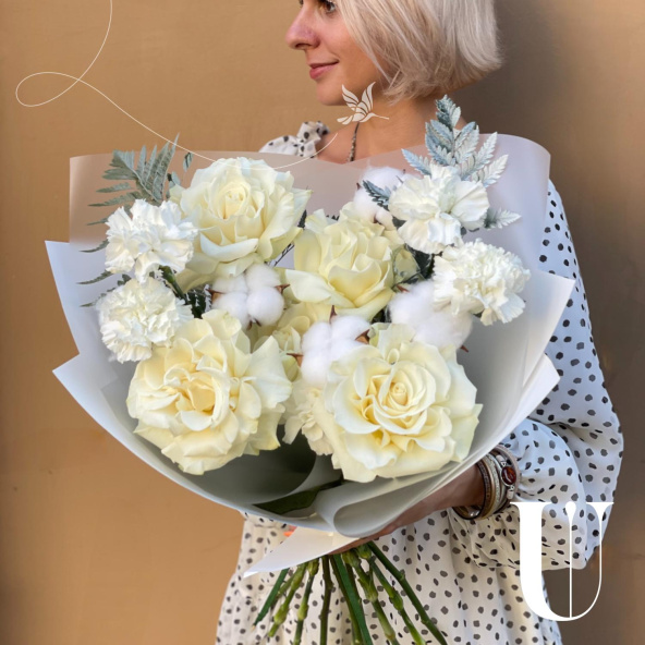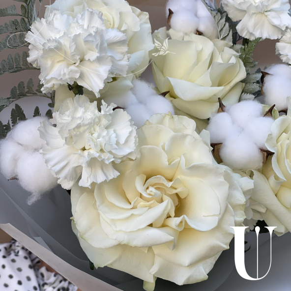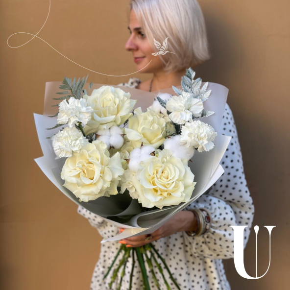 Этот букет — как музыкальное произведение, построенное на чистой полифонии белого. Французские розы задают главную тему — благородную и выразительную, подобно баховской мелодии. Гвоздики вторят им строгим контрапунктом, а пушистый хлопок смягчает композицию, словно тихий аккомпанемент клавесина.