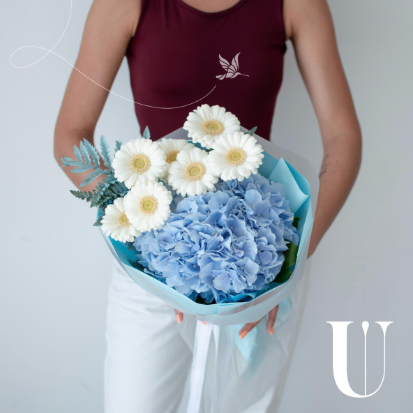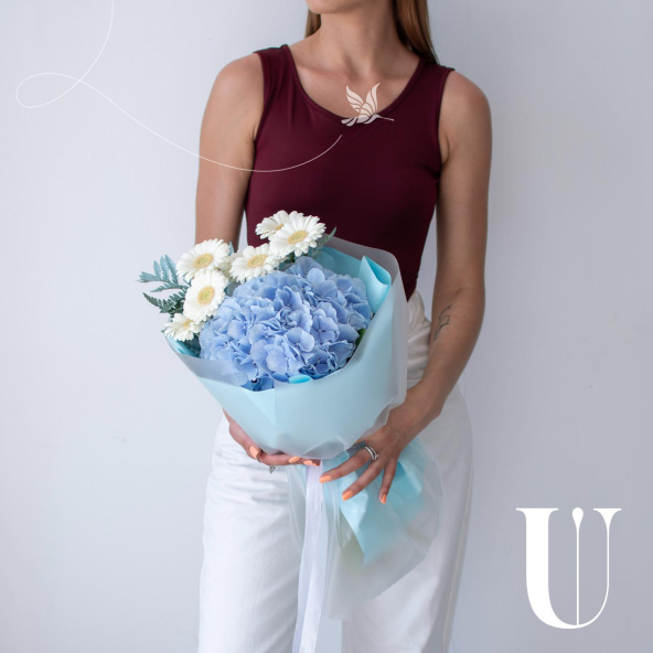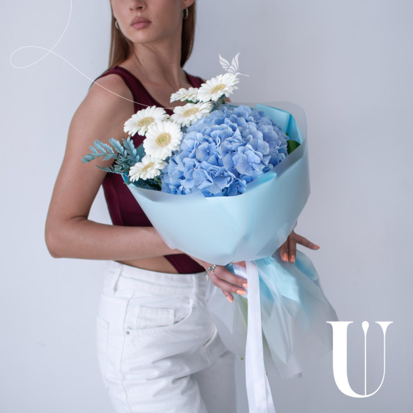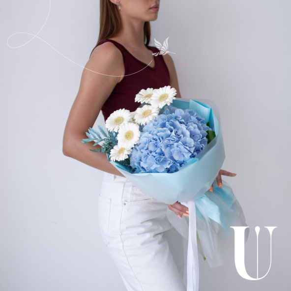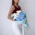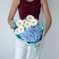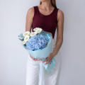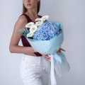 Сборный букет из голубой гортензии, белых диантусов, кремовых роз и кустовой розовой розы в бирюзовой упаковке
