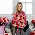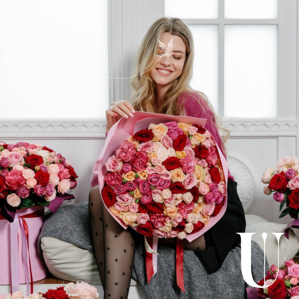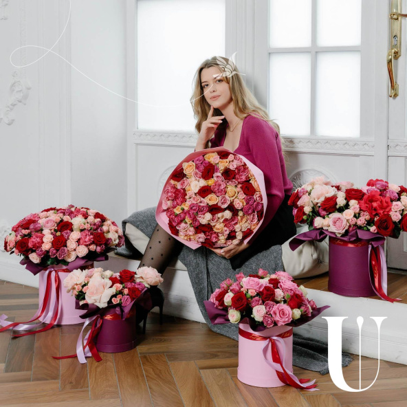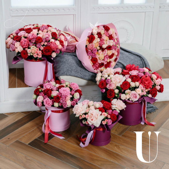 - шляпная коробка 25*28 см: роза французская Готча - 3 шт; роза Пинк Мондиаль - 2 шт; роза Ред Наоми - 10 шт; роза кустовая, малиновая - 4 шт; роза кустовая розовая - 3 шт: роза кустовая Бомбастик - 6 шт: роза светло-розовая - 7 шт.