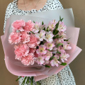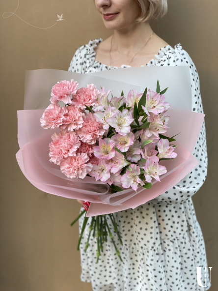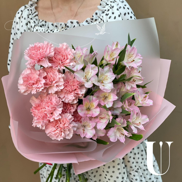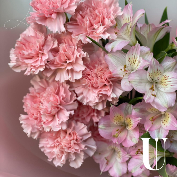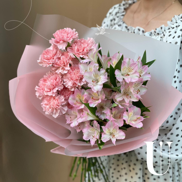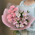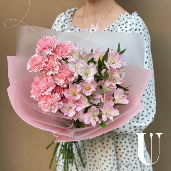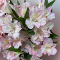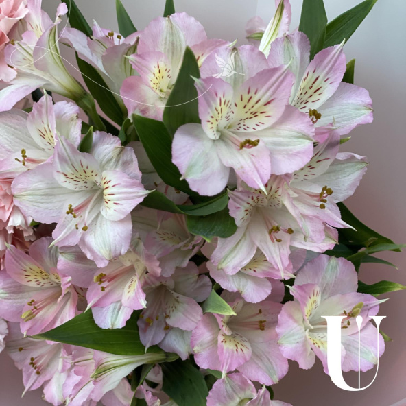 Пять альстромерий с их изящными лепестками и тонкими стеблями — это легкие, воздушные завитки на решётках Летнего сада или росписи плафонов Эрмитажа. Они придают букету динамику, мягкость и ту самую «нежную трепетность», которую воспевали поэты Серебряного века.